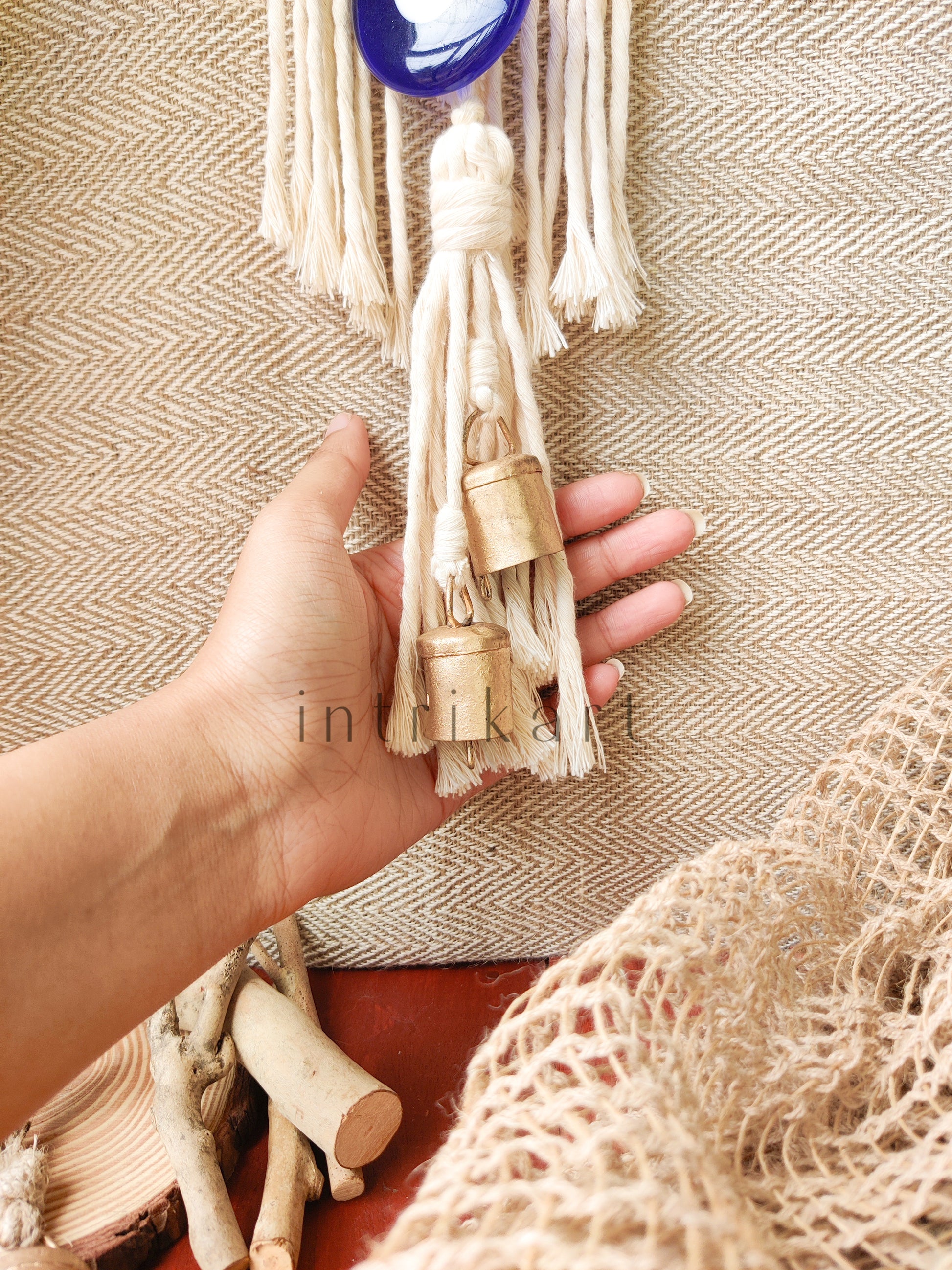 Classic off white wall hanging adorned with evil eye and tassels. Whether you're seeking protection from negative energies or simply adding a touch of mystique to your home, the Mini EvilEye Macramé Wall Hanging is a captivating expression of artistry and symbolism. Elevate your space with its enchanting presence and embrace the magic of ancient traditions reimagined for the modern world.